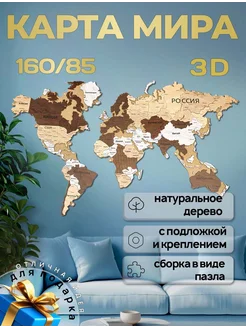 3д карта мира настенная из дерева 160х85 см, пазлы