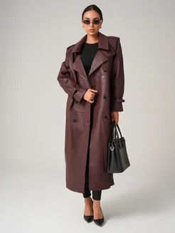 Плащ осень кожаный длинный бордовый