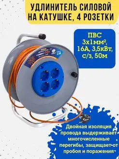 Удлинитель на катушке 4 розетки ПВС 3х1мм² 16А 35кВт б з 50м