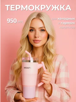 Термокружка 950 мл, трубочка, две крышки (розовая)