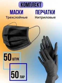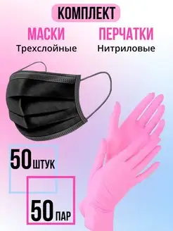 Перчатки 50 пар + маски 50 шт черный голубой розовый