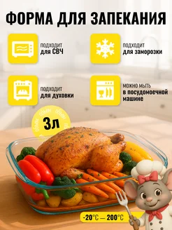 Форма для запекания прямоугольная, жаропрочное стекло 3 л