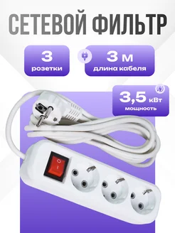 Сетевой фильтр 3 розетки 3 м 3500 Вт с выключателем