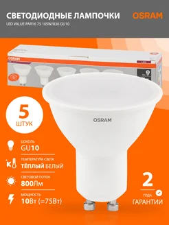 Лампочка GU10 Led Value PAR16 800лм 10Вт 3000К 5 штук