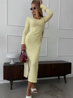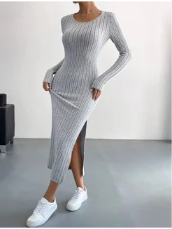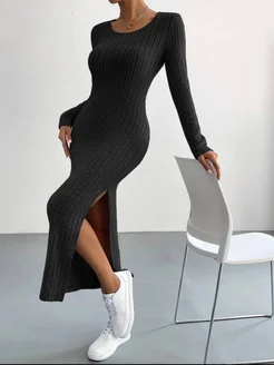 Трикотажное зимнее платье в рубчик с длинным рукавом