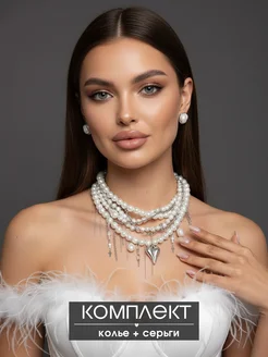 Колье на шею и серьги из жемчуга комплект бижутерия
