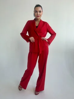 Костюм шелковый брючный с перьями