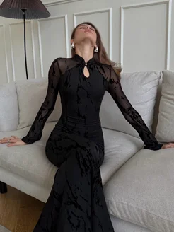 Платье вечернее нарядное с разрезом и рукавами клеш