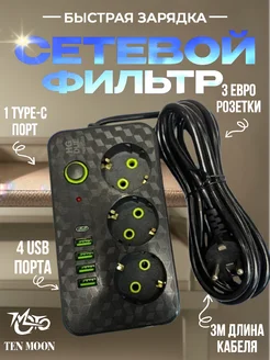 Сетевой фильтр 3 метра 3 розетки 4 USB+Type-C