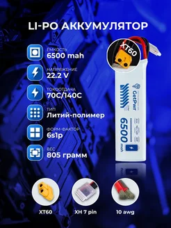Аккумулятор для квадрокоптера FPV дрона 6500 22.2