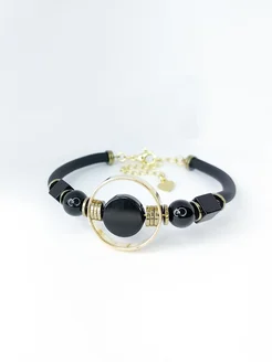 Браслет каучуковый с натуральным черным ониксом и янтарем