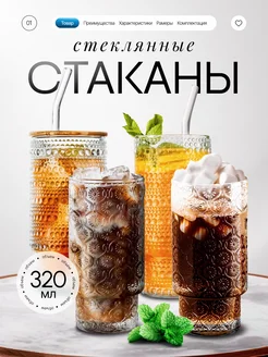 Стаканы стеклянные с крышкой и трубочкой набор 4 шт