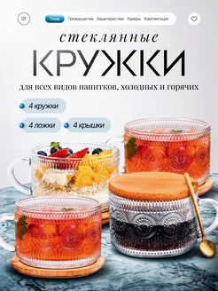 Кружки стеклянные с крышкой и ложкой набор 4 шт