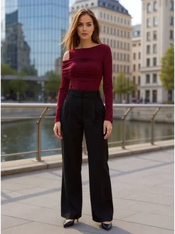 Лонгслив с драпировкой на одно плечо вишневый