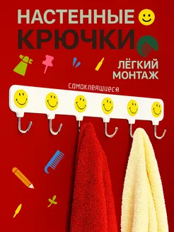 Крючки на планке 6шт, настенные детские на липучке, смайлики