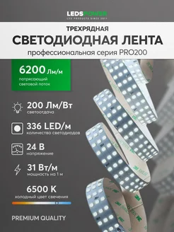 Светодиодная лента 3м 24V холодная 6500К трехрядная ПРО200