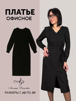 платье-футляр черное с V-вырезом и длинным поясом