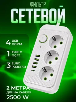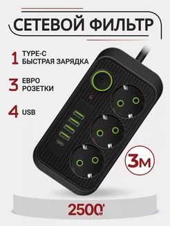 Сетевой фильтр с USB и Type C тройник Удлинитель