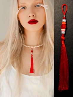 Подвеска на шею с кисточкой и жемчугом длинная красная