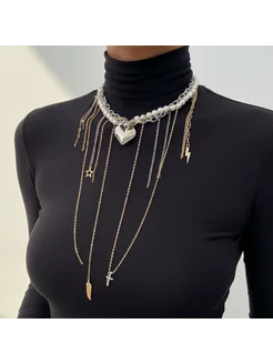 Колье длинное чокер на шею с жемчугом сердцем подвесками