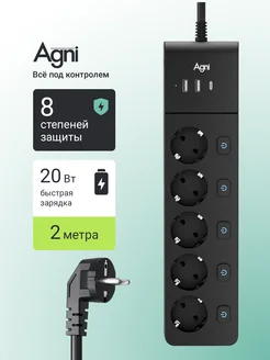 Сетевой фильтр с USB Type-C 5 розеток 2 м