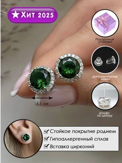 Серьги гвоздики круглые пусеты зеленые серебристые цирконий