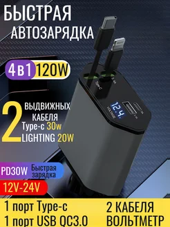 Автомобильная зарядка для телефона Type-C + USB-A + 2 кабель