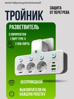 Тройник 3 розетки 2 Usb и 1 Type-c