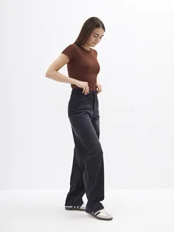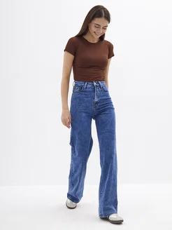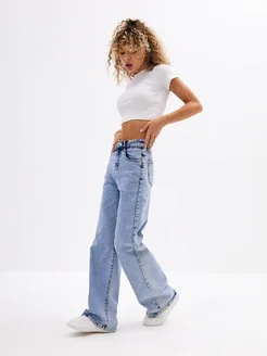 Джинсы прямые широкие синие трубы с высокой посадкой осенние
