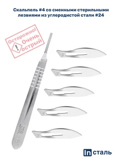Скальпель медицинский хирургический №4 + лезвия №24 (5 шт.)