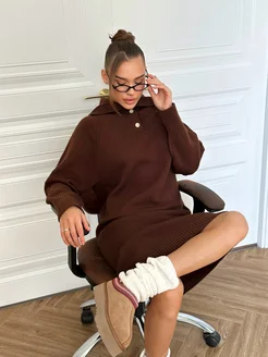 Платье вязаное теплое миди воротник стойка поло