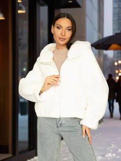 Шуба из искусственного меха белая короткая с капюшоном