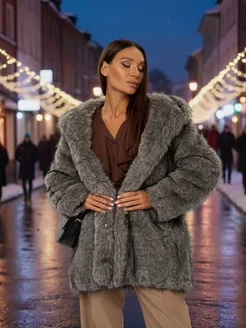 Шуба из искусственного меха серая