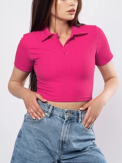 Укороченный кроп топ в рубчик с рукавами и воротником