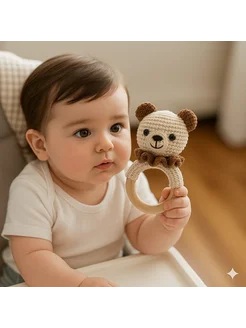 Вязаная игрушки-Погремушка медвежонок с деревянном кольцем
