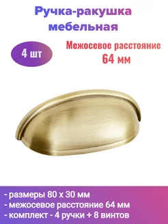 Ручка-ракушка мебельная 64 мм сталь, старинное золото, 4 шт