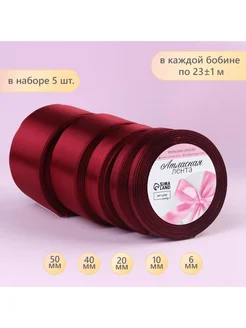 Атласная лента, набор 5 шт, 6 10 20 40 50 мм, 23±1 м, бордо