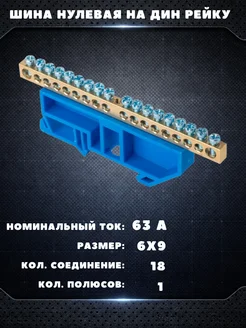 Шина нулевая на дин рейку 6х9 мм 18 отверстий 63А 1шт