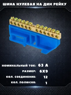 Шина нулевая на дин рейку 6х9 мм 12 отверстий 63А 1шт