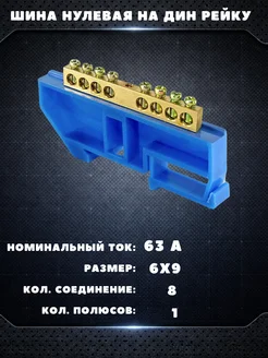 Шина нулевая на дин рейку 6х9 мм 8 отверстий 63А 1шт