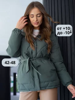 Куртка демисезонная с капюшоном на поясе стеганая утепленная