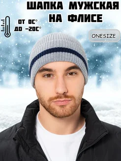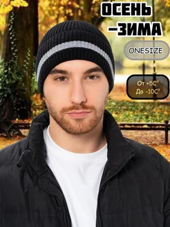 Шапка демисезонная вязаная бини с отворотом с полоской