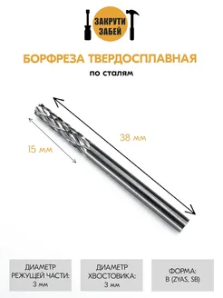 Борфреза по сталям 3х15х3х38, цилиндр с торцевым зубом В