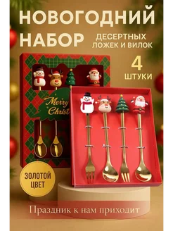 Новогодняя посуда набор столовых приборов на 2 персоны 4 шт