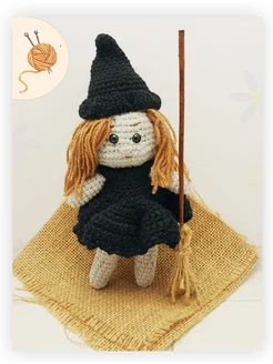 Вязаная кукла Ведьмочка с метлой 20см