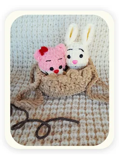 Вязаная игрушка зайка и кошечка в корзинке