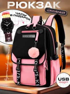 Портфель школьный рюкзак с помпоном для учащихся с часами