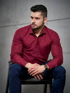 Рубашка бордовая приталенная хлопок с длинным рукавом