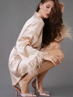 Халат шелковый атласный свадебный утро невесты с перьями