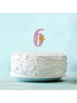 Топпер для торта цифра 6 с короной розовый, 6 шт